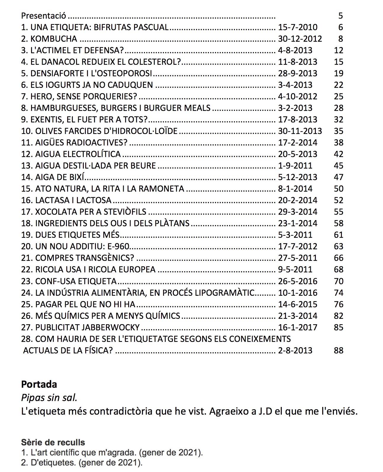 L’actimel et defensa?, Pagar pel que no hi ha, Aigua electrolítica, Compres transgènics?, Més químics per a menys químics, …són algunes de les entrades temàtiques que inclou el recull.