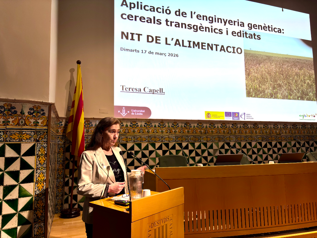 A continuació, Teresa Capell, catedràtica de Biotecnologia de la Universitat de Lleida (UdL)-Agrotecnio, va abordar els avenços en agricultura vinculats a l’enginyeria genètica. La seva ponència va explorar el desenvolupament de cereals transgènics i editats genèticament, així com el potencial d’aquestes tecnologies per millorar la sostenibilitat i la seguretat alimentària. Capell, amb una llarga experiència en centres de recerca internacionals, va remarcar la importància d’apropar aquests coneixements a la societat.